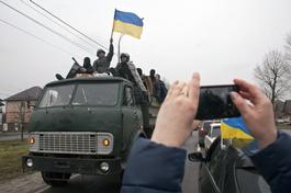 UKRAINE. Kyiv. February, 2014. Protesters and member of the self defense group enroute to President Yanukovych"™s private compound.