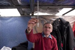 UKRAINE. Kyiv. February, 2014. Protester with rosary in a makeshift tent at a barricade on Hrushevsko Street.
