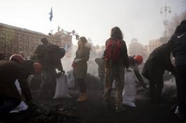 UKRAINE. Kyiv. February, 2014. Protesters in Independence Square cleaning up burned barricades, building new barricades, and bringing flowers to memorials of those killed by snipers and riot police between February from 18th to 20th.