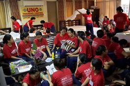 PHILIPPINES. Manila. 2013. A crowded classroom where young women train to be housemaids in the Gulf states. In a 3-week course, they learn skils like bedmaking, table setting, cleaning, shoe polishing and babycare.