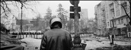 UKRAINE. Kyiv. February 2014. Protester facing riot police at a barricade on Hrushvesko Street, near Independence (Maidan) Square.