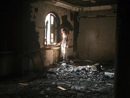 EGYPT. Al Nazla. August 20, 2013. A local resident stands amid the charred remains of the Virgin Mary church in the village of Al Nazla, about 120KM outside of Cairo. The church was burned and looted by an alleged mob of pro-Muslim Brotherhood residents of the village.