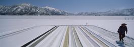 JAPAN. Shiozawa, Niigata. 2003. Yuki zarashi is thought to restore the colors of a used kimono. Old kimonos made of tsumugi or pongee silk in Shiozawa are returned there every fifty years or so to bring back the original colors. To get the maximum effect, the unassembled pieces are dried over snow under blue sky.