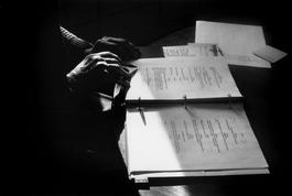 USA. Roxbury, CT. 1994. The hands of author Arthur MILLER as he makes minor changes to the script of his latest work "Broken Glass" after a read through with the play's cast.