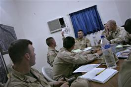 IRAQ. Baghdad. April 21, 2005. FOB Camp Independence, former city airport. CPT BALLANCO at daily officers meeting. Presents new target signs.