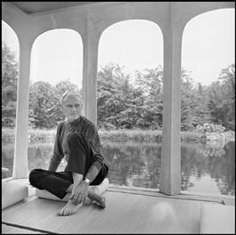 USA. Newcannon, CT. 1964. Architect Philip JOHNSON sitting in his "Glass House" which he designed in 1949.