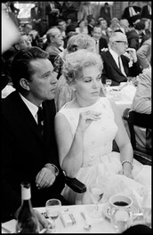 USA. Los Angeles, California. 1959. Film star Kim NOVAK listens skeptically to Krushchev's boasts - that Russia will soon leave the USA behind in consumer production.