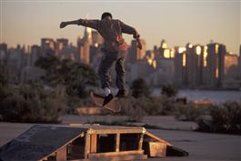 USA. NYC. Brooklyn. Williamsburg. Skateboarder with NYC in the background.