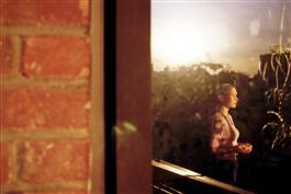 USA. New York City. 2001. Laara MATSEN (wife of photographer), on the balcony of their apartment on a summer evening.