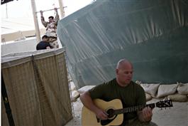 IRAQ. Falluja. June 11, 2005. al-Anbar province. Marine playing guitar while Iraqi soldiers work out. 2nd MEF (Second Marine Expeditionary Force), US Marines from Camp Lejune, North Carolina. 4th Marine Reserve. According to the new military plan, US Marine/Army units are getting attached to new Iraqi pro-American forces in an effort to gradually hand security operation over to the Iraqis.
