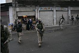 IRAQ. Out of camp Patriot and Merez, Mosul. 2005. Task Force 1-14. Foot patrol in the old city is trying to scout election sites. Get under RPG and machinegun fire.