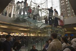 USA. New York City. 2006. Opening of Apple Store on Fifth Avenue. 30 ft. high glass cube with Apple logo. Glass staircase leading down into the store.