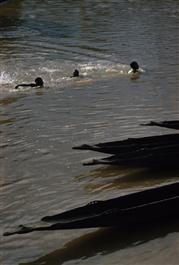 NEW GUINEA. 1960. Swimmers around alligator boats.