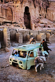 AFGHANISTAN. Bamiyan. 2003. Boys play around an abandoned van.