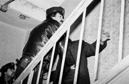 USA. New York City. 1979. A drug addict is searched for drugs in the hallway of an abandoned building.