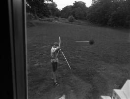CANADA. Lambton County, Ontario. 1999. Noah TOWELL shoots a rubber tipped arrow at a house window. ©Larry Towell/Magnum Photos