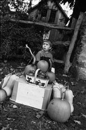CANADA. Lambton County, Ontario. 1999. Isaac TOWELL sells squash, pumpkins and tomatoes to local passing traffic by the roadside in front of his house. Rural residents commonly sell extra garden produce to passing motorists. Squash and pumpkins are being sold 2 for $1 to subsidize the fatherÕs photography income. The bush behind him is a forsythia. The fence was built by the photographer from black locust poles. The house is covered in board and batten pine (barn board). ©Larry Towell/Magnum Photos