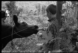 CANADA. Lambton County, Ontario. 2000. Noah TOWELL feeds a corncob to a cow through the fence that runs beside the house. Corn is a main commodity grown by Ontario farmers. Most is used as cattle fodder. Beef cattle and dairy provide a main source of farming income as well as grain. ©Larry Towell/Magnum Photos