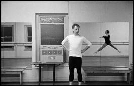 USA. New York City. 1957. Choreographer Merce CUNNINGHAM with dance Anita HUFFINGTON in the mirror.