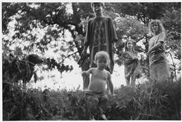 CANADA. Lambton County, Ontario. 1996. Noah, Isaac, and Naomi TOWELL stand on a bank with their mother, Ann, and pet dog Banjo after swimming in the Sydenham River. Behind them is a large black walnut tree. ©Larry Towell/Magnum Photos