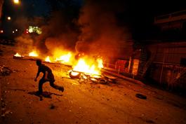 NEPAL. Kathmandu. 2006. Youth throwing rocks at the Armed Police...