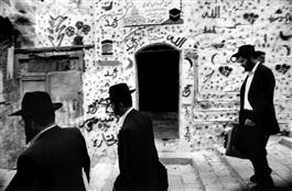 ISRAEL. Arab Quarter, East Jerusalem. 1994. Three orthodox Jews walk through the Arab Quarter of the Old City past a Muslim house decorated to show that the resident family has just made a pilgrimage to Mecca. Orthodox Jews often walk through the Arab Quarter on their way to the Western Wall to pray. The site of the Temple Mount (known by Jews) and al-Aqusa Mosque (for Muslims) are on the same spot, therefore, holy to both. East Jerusalem has been occupied by Israel since the 1967 war.