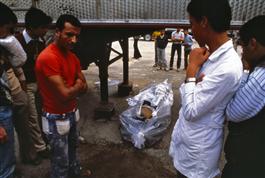 LEBANON. Beirut. November, 1983. A corpse on Tripoli's street. Morgue and refigerator trucks were full.