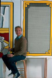USA. Long Island, New York. 1982. Pop artist Roy LICHTENSTEIN with painting in his Southampton studio.