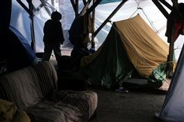 USA. Oregon. Portland. 2002. Dignity Village. A view of seating area and tents in a covered area.