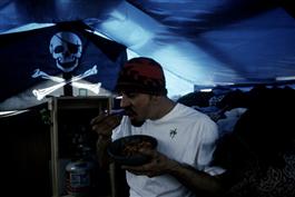 USA. Oregon. Portland. 2002. Dignity Village. A young resident eating in his tent.