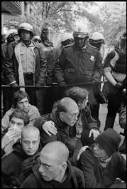 USA. Washington DC. September 27, 2002. During anti-globalization demonstrations, protesters are arrested in front of the Citibank building, K Street and Vermont Avenue. Local and federal police who quickly outnumbered and overwhelmed the protesters arrested 649 persons. They were charged with "failure to obey" in spite of the fact no warning was given and they were not allowed to disperse. Corralled protesters sit in a group prior to mass arrest. Several journalists were also arrested along with protesters.