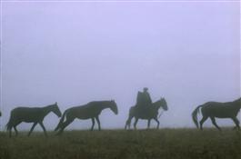 USSR. 1963. Some horse herders tend to their animals high up on a mountain near Pitagorsk. They still wear the broad-shouldered Caucasus cloak made of black sheepskin.