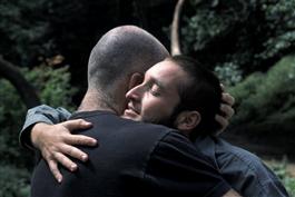 USA. San Francisco, California. September 11, 2002. "Q-Spirit" (Queer Spirit), a gay and lesbian group, remembers victims of September 11th with a gathering of drums, hugging, and healing in the National AIDS Memorial Grove in Golden Gate Park.