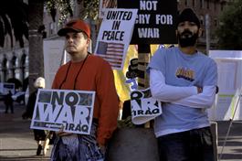 USA. San Francisco, California. September 11, 2002. In the late afternoon, alternative and anti-war groups hold a peace rally with music, speeches, and individual posters at Justin Herman Plaza at the Ebarcadero.