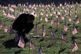 USA. San Francisco, California. September 11, 2002. As a memorial to the victims of September 11th, 3037 small flags are planted in Washington Square in San Francisco's North Beach neighborhood. Foreign victims are represented by the flags of their 57 homelands.