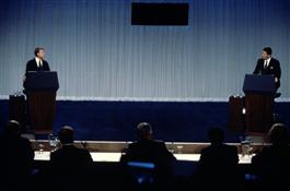 USA. Cleveland, Ohio. October 28, 1980. President Jimmy CARTER and Ronald REAGAN during presidential debate.