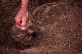 NORTHERN IRAQ. Kurdistan. 1991. The careful digging around a skull at a mass grave site. A brush is used to protect the skeleton in order to gather as much information as possible to determine the cause of death.