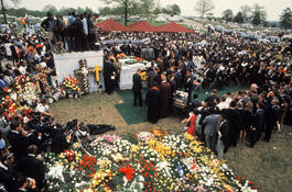 USA. Georgia. Altanta. April 9, 1968. Mourners and members of the media watch as the casket of Martin Luther KING is brought to his grave site.