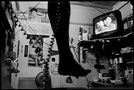 USA. New York City. 1998. An immigrant watches a Chinese soap opera on his day off.