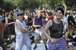 USA. New York City. 1993. Gay Pride Parade. Crowd celebrates on lawn at Pride celebration.