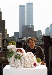 USA. New York City. 1989. Artist JEFF KOONS with one of his sculptures on the roof of the Sonnabend Gallery in Soho. World Trade Center in background.