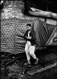 PAKISTAN. Karachi. 2008. Outside a shop that people believe was burned by Islamists but actually was not. A boy walking.