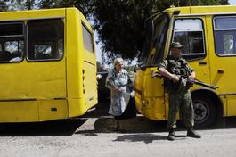 GEORGIA. North of Gori. AUgust 19, 2008. Humanitarian aid, Georgian civilian and Russian soldier.