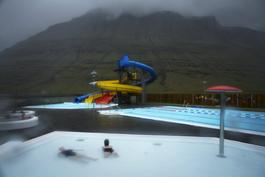 ICELAND. Eskifjordur. 2007. People relaxing in the hot waters of an outdoor swimming pool in Eskifjordur, one of the two towns adjacent to the Alcoa Fjardaal smelter. The towns in this area have been economically depressed for years, particularly with the decline of smallboat fisheries. Locals complain of declining populations and a bleak future. The arrival of the Alcoa smelter have made Eskifjordur and Reydarfjordur are small-scale 'boom-towns' with new construction and growing populations. A new $6 million swimming pool complex was built in Eskifjordur, significant for a town of only 1,000 people.