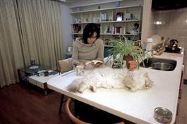 JAPAN. Tokyo. 2003. Yoshiko Suzukiand her cat Grigrie lives in a two-room apartment within walking distance of both Tokyo Station and Ginza, and a short bicycle ride to her office.