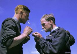 RAF pilots enjoy a cigarette at a Royal Air Force base before they prepare for a daylight bombing raid over Occupied France.