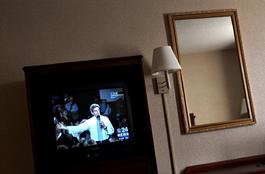 USA. Bowling Green, Ohio. September 2004. Kerry on TV campaigning in Toldeo. Highest amount of campaign TV spots air in Ohio.