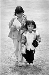 VIETNAM. LAU Thi Binh, nine has a slight mental disability. She does not attend school, but is in the embroidery class. Her friend Loan (on right) suffers from dwarfism. Born in Yen Noi village, Ha Tay Province, she is bright and attends primary school. 2002