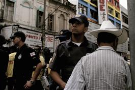BRAZIL. Sao Paulo. Police patrolling Downtown near the Sao Vito neighbourhood where most of the illegal street vendors are active. 2004.