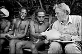 INDONESIA. Irian Jaya. 1989. Members of the Dani Tribe look at pictures from 1959. Robert GARDNER, American filmmaker, Director of "Dead Birds" returned to Irian Jaya 30 years after the making of his film about the Dani tribe.